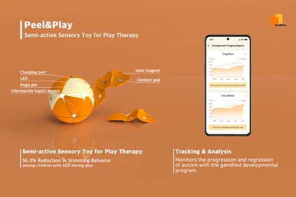 Peel&Play is a semi-active SMART sensory toy comprised of twenty interlocking pieces that can be peeled from the main body and rebuilt into any desired shape, which emulates the playful act of peeling an orange. The toy serves two purposes: 1)addressing self-stimulatory stimming behaviors (e.g., hand flapping, head rocking) among children with autism spectrum disorder (ASD) and related disabilities, and 2)monitoring changes in children’s development based on play therapy. Alongside the hardware with a therapeutic effect of 56.3% immediate reduction in stimming behavior, our AI-based software analyzes developmental progress through various data-driven parameters to monitor progression and regression of autism.